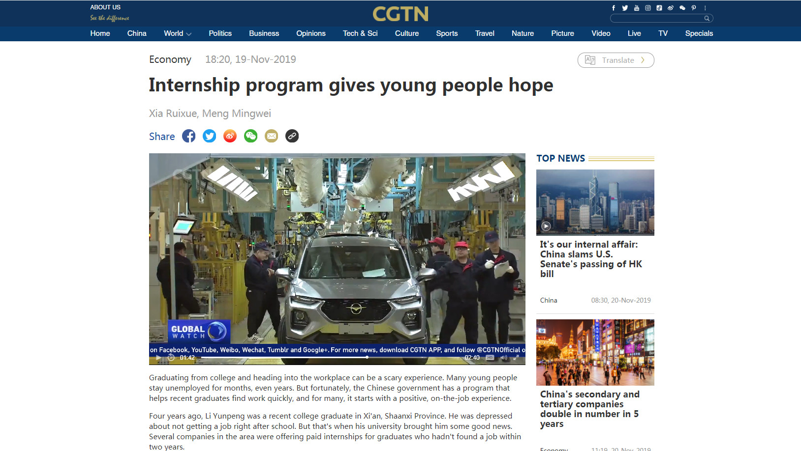 今天,一条2分40秒的全英语新闻视频,被刷屏。11月19日12点,中国国际电视台“环球瞭望”节目(CGTN Global Watch)播出《FINDING A JOB:Internship program gives young people hope》(《如何找工作:就业见习政策给年轻人带来希望》)视频报道。作为国家级就业见习示范基地,海马汽车在就业见习方面提供的“海马经验”,成为国家级国际传播平台关注的亮点,并通过其日播新闻类节目“环球瞭望”(CGTN Global Watch)及CGTN.com等平台向全球播出。