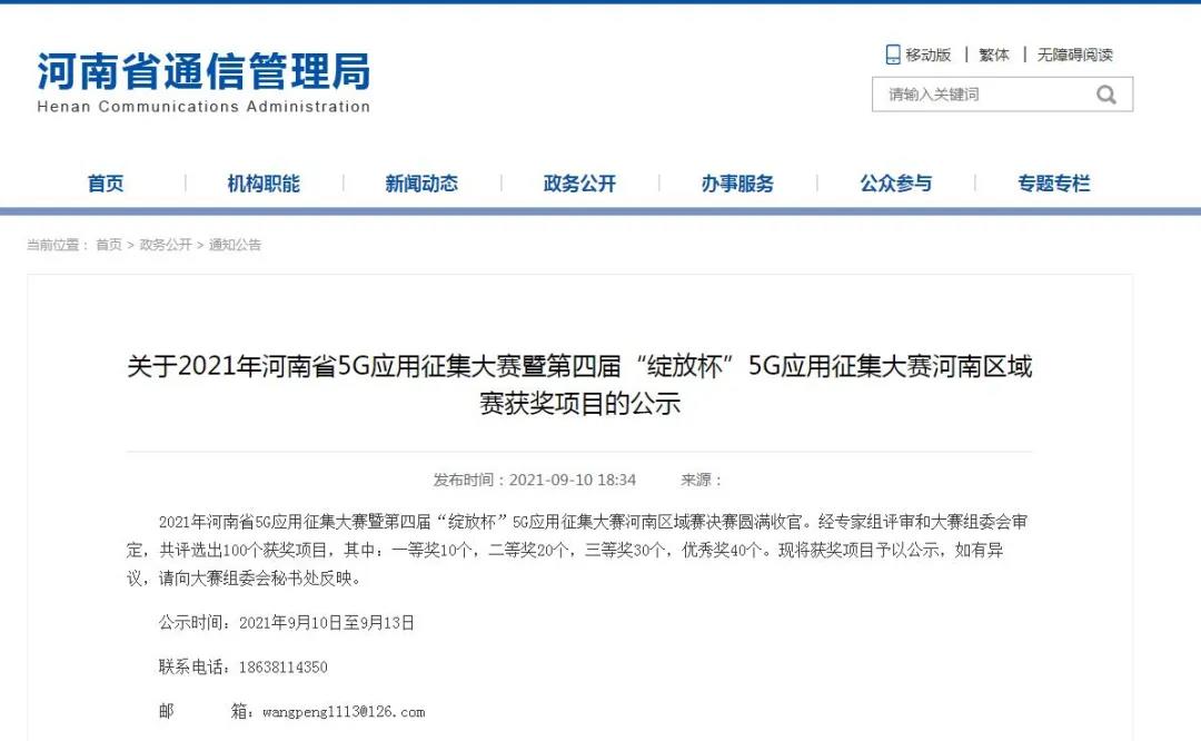 大赛自5月17日正式启动以来,得到河南省市区各级政府部门的大力支持和业内各方的积极响应,参赛项目涉及5G+智慧园区、城市、工业、医疗、交通、旅游、教育、矿山、政务、科技、农业、金融、新媒体、泛在低空等14个行业35个细分领域。最终,经专家组评审和大赛组委会审定,从995个报名参赛项目中共评选出100个获奖项目,其中:一等奖10个,二等奖20个,三等奖30个,优秀奖40个。